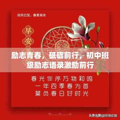 初中班级励志语录是我们前行的动力,也是我们青春的座右铭,让我们一起在青春的岁月里,燃烧激情,砥砺前行,无论遇到多大的困难,我们都要坚定信念,勇往直前,相信只要我们努力拼搏,一定能实现自己的梦想,让我们携手共进,共创辉煌!