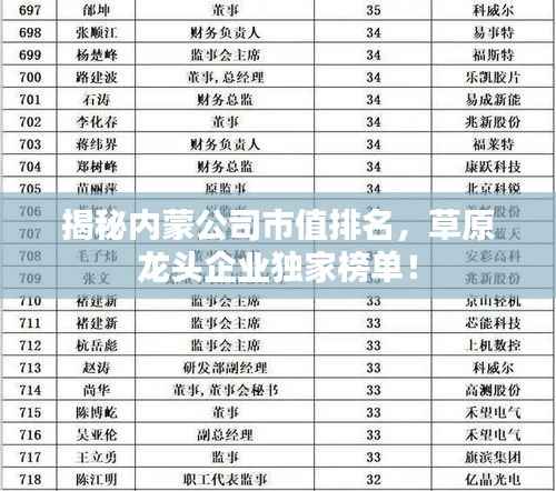 随着经济的蓬勃发展,内蒙古自治区的企业也如草原上的骏马般驰骋前行,近年来,内蒙公司在国内外市场的表现引人注目,其市值更是水涨船高,本文将为您揭示内蒙公司市值排名,探究谁是草原上的龙头企业。