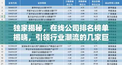 在当今数字化时代,网络投资已成为越来越多人的选择,随着这一领域的快速发展,各大在线公司纷纷崭露头角,本文将围绕“网投在线公司排名”这一主题,介绍几家行业内领先的在线公司,帮助投资者更好地了解市场概况,把握投资机会。