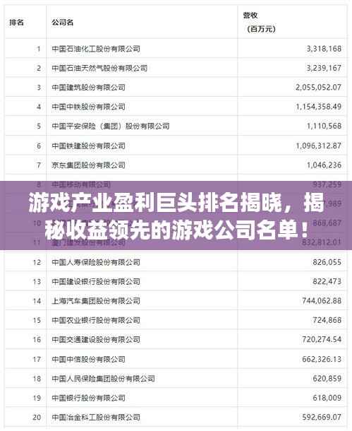 随着科技的飞速发展和全球化的推进,游戏产业已经成为一个巨大的经济引擎,在这个繁荣的行业中,各大游戏公司的收益状况如何?本文将为您揭示游戏收益公司的排名,带您了解这个行业的盈利巨头。