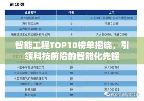 就是智能工程排名前十名的公司或机构,它们在智能化技术研究和应用方面取得了显著成就,为全球智能工程的发展做出了重要贡献,随着科技的不断发展,这些公司将继续引领智能化潮流,推动智能工程领域的进步和创新,我们期待着它们在未来能够带来更多的惊喜和突破,为人类的科技进步和生活改善做出更大的贡献。